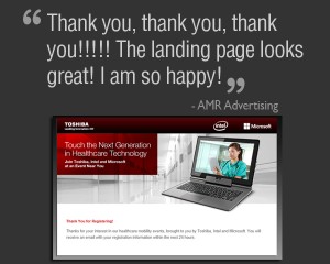 Recently, ASTRALCOM had the privilege of working with one our advertising agency clients, AMR Advertising in Fullerton, California. Their client, Toshiba, needed help creating a landing page with a form-to-database component for an industry-related event. Event attendees who completed a form received a personalized confirmation page with event details which they could print on command, and they received a Toshiba-branded rich HTML email reminder with these same event details. Additionally, attendees were segmented into four distinct geo-specific audiences upon form submission. The database was leveraged as a CRM tool for further e-mailings using HTML-rich communication pieces. This was a quick turn-around project for AMR and we were happy to be able to accommodate their needs. AMR’s response was “Thank you, thank you, thank you!!! The landing page looks great! I am so happy!” also, “Thank you again for all your hard work and accommodating our very intense schedule.”