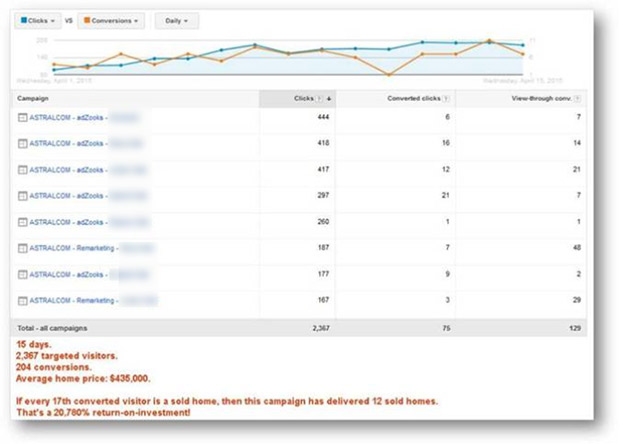 It’s true. Have a look at this screen shot from a campaign we’re running for another homebuilder. With the majority of these campaigns converting in double-digit territory, this builder is enjoying a robust 86,000% return on marketing investment – in only one specific channel – over only a 3-week period.