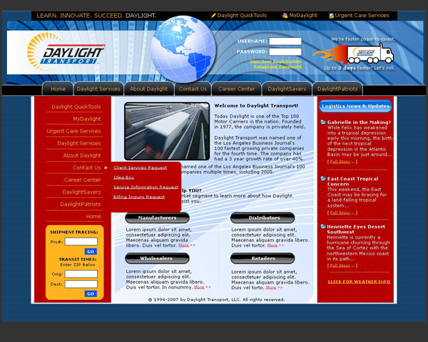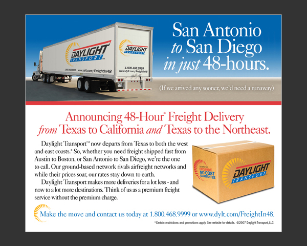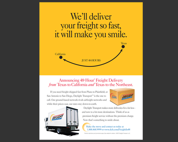Launching a new division, sales territory, or in Daylight Transport’s case, a new shipping and delivery route is nearly always a challenge. But when the agency and the client have a truly synergistic relationship, great things happen. We made it easy for Daylight to open new routes and to connect with new customers. We developed a new web presence and supporting marketing and advertising materials, with top-notch creative and effective calls-to-action.