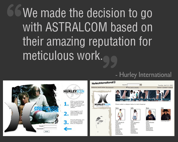 Finally, when an online order is placed, it is fed directly into the legacy system for fulfillment. Now that’s digital business done right – and within the two-week window that Hurley wanted. Even before we started, Hurley knew that ASTRALCOM was the right e-business team for them. “We made the decision to go with ASTRALCOM based on their amazing reputation for meticulous work and fast paced service” said Pete Rocky, Online Marketing and Business Manager for Hurley.
