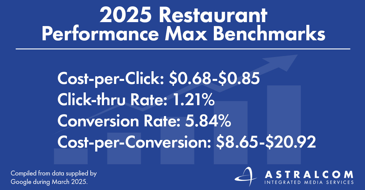 Restaurant industry standards show that the cost-per-click typically ranges from $0.68 to $0.85, with an average click-through rate of 1.21% and a conversion rate of 5.84%. Meanwhile, cost-per-conversion falls between $8.65 and $20.92, depending on factors like campaign targeting and budget. At ASTRALCOM, we’re delivering a cost-per-conversion of a mere $0.90. These benchmarks offer a baseline to measure your ad performance—so how are yours doing? To assess your Performance Max data, restaurant marketers can access campaign insights directly within Google Ads Analytics under “Campaigns.” By reviewing key metrics such as CPC, CTR, conversion rate, and cost-per-conversion, you can fine-tune your targeting, adjust budgets, and optimize creative assets to set new, more ambitious goals for your next campaign. If your performance falls behind industry benchmarks, you can start by refining your audience targeting, testing new creative variations, and adjusting bidding strategies. Better yet, contact ASTRALCOM and tell us how your data compares to the benchmarks – we’d love to help you exceed the competition’s standards.